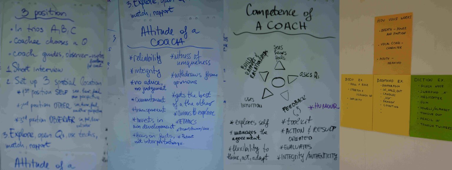 Next part of the training was exploration of what the proper attitude of a coach should be, as well as the competences he has to have (see flipcharts), around which a discussion was held. After that, the training offered us a lot of space to practice. We formed trios and had a chance to see and later on experiment with several practical tools. Several conversational techniques were offered for practice (backtracking, lazy coach, reflection on feeling, shooting from the hip) that are used during dialog and help facilitate certain objectivity. Then, we familiarised ourselves with the “hoponopono technique”. Also, we had a specific instructor that gave the opportunity for us to practice our voice, tone and verbal expressions. With this, the whole VAK representation in the participants was satisfied, since we used a lot of schematics in flipcharts for explanation – for the Visuals, this with voice training – for Auditory, and the whole set of dedicated space and time for practice was – for the Kinestetics/ Digital ones. And of course, the more typical practicalities for NLP were also present; the rapport, the anchoring and the reframing approaches. It was also explained how we can use a timeline as a technique for elaborating on personal issues, and also one of the participants offered technique for working with our personal limiting beliefs.