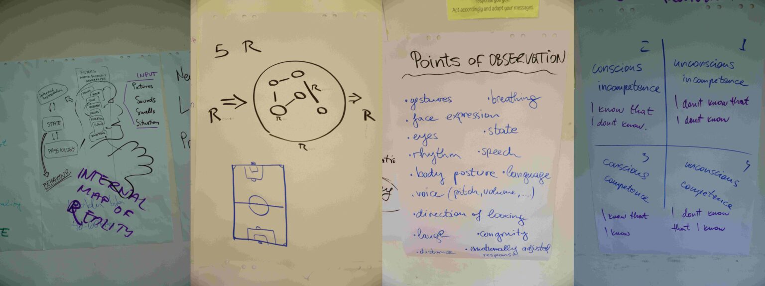 If we recapitulate what we got from this training, we can say that much of the basics in the NLP theory practice was broadly elaborated, and we had a lot more time to work with the practical exercises that were given to us. Speaking more concretely, in the theoretical part, we went through the basic meta-model of NLP (as explained by Bandler and Grinder, 1975) and then we elaborated it more with the “third generation model” of interlinking between physiological cues, language and cognitive characteristics. We had a chance to briefly familiarize ourselves with the 5 “R” in a setting (the Resources we have and use as an input in the ‘situation’, then the Roles that are played, the Relationships that are happening, the Rules that need to be followed in order this to be a proper ‘situation’ and at the end, as output the Results). In this manner, certain roles we need to know are the ones that are part of the learning trio of ABC, where “A” is talking/sharing, “B” is learning/listening and “C” is observing/observer. Once a ‘setting’ is established, the main philosophy of everything is that whatever we observe, our interpretation of it is something different (this is also elaborated as the ‘event’ vs. ‘story’ difference in any given situation). This was brought to us alongside the main NLP idea that the “map is not the territory”. The most interesting input here was the fact that “the most flexible part of any system is usually the part that controls it”. Calibration of our input/output was also mentioned, calibration of what we bring to a situation as well as what we take, or recieve. This was recapitulated after a few days as points of observation that the theory gives (see flipchart). The representational systems of the personality were also elaborated (the Visual, Auditory, Kinestetic were mentioned in “NLP Volume 1” from Dilts, Binder, Grinder and DeLoiter from 1980, but also the Digital was included later in the training.) The eye accessing cues viewpoint was also mentioned. From the more psychological standpoint was the schema presented of how unconscious/ unconscious can be seen in relation to what competency and incompetence are, and alongside with this, the “presuppositions” were elaborated regarding the information that is implicit in a communication that is happening in a setting.